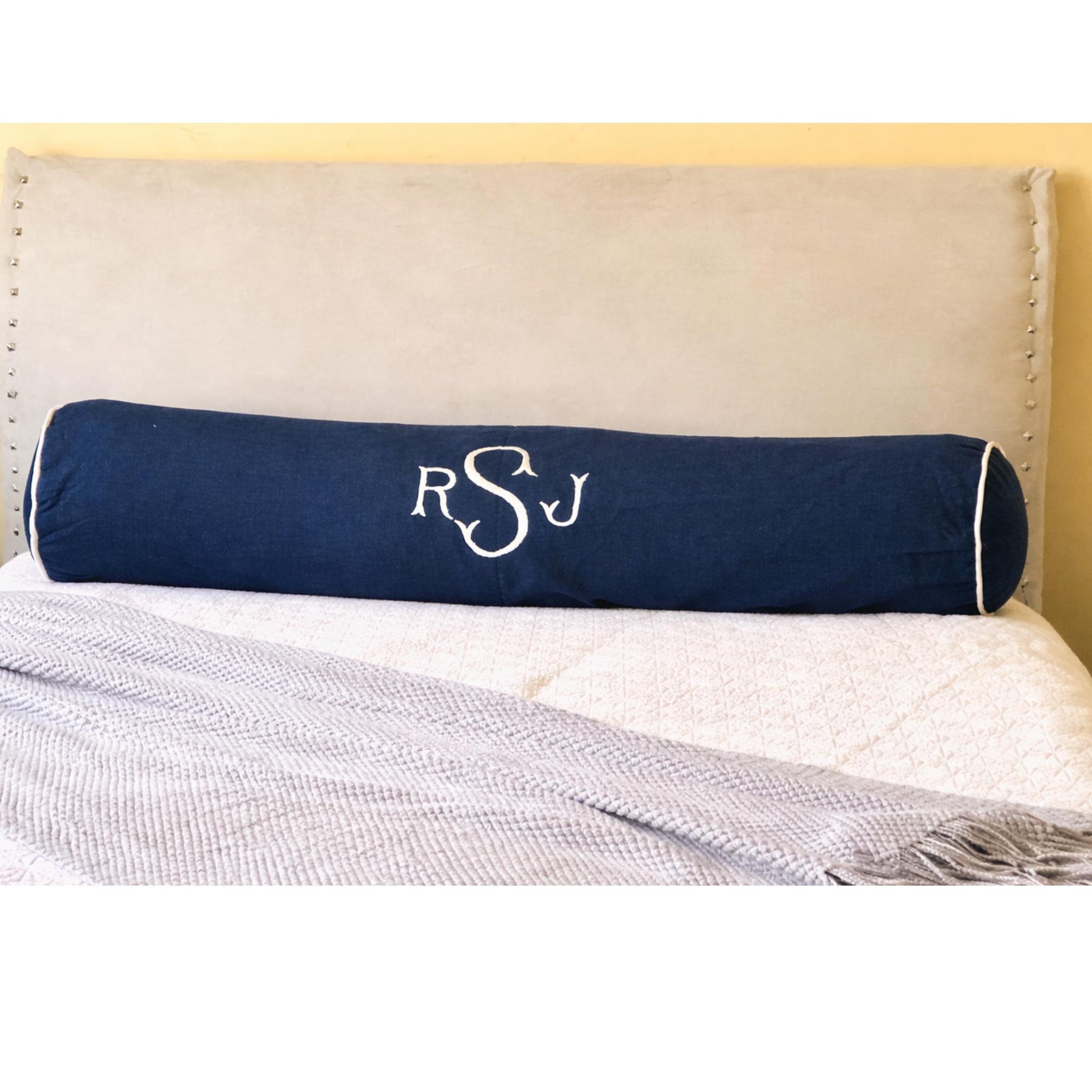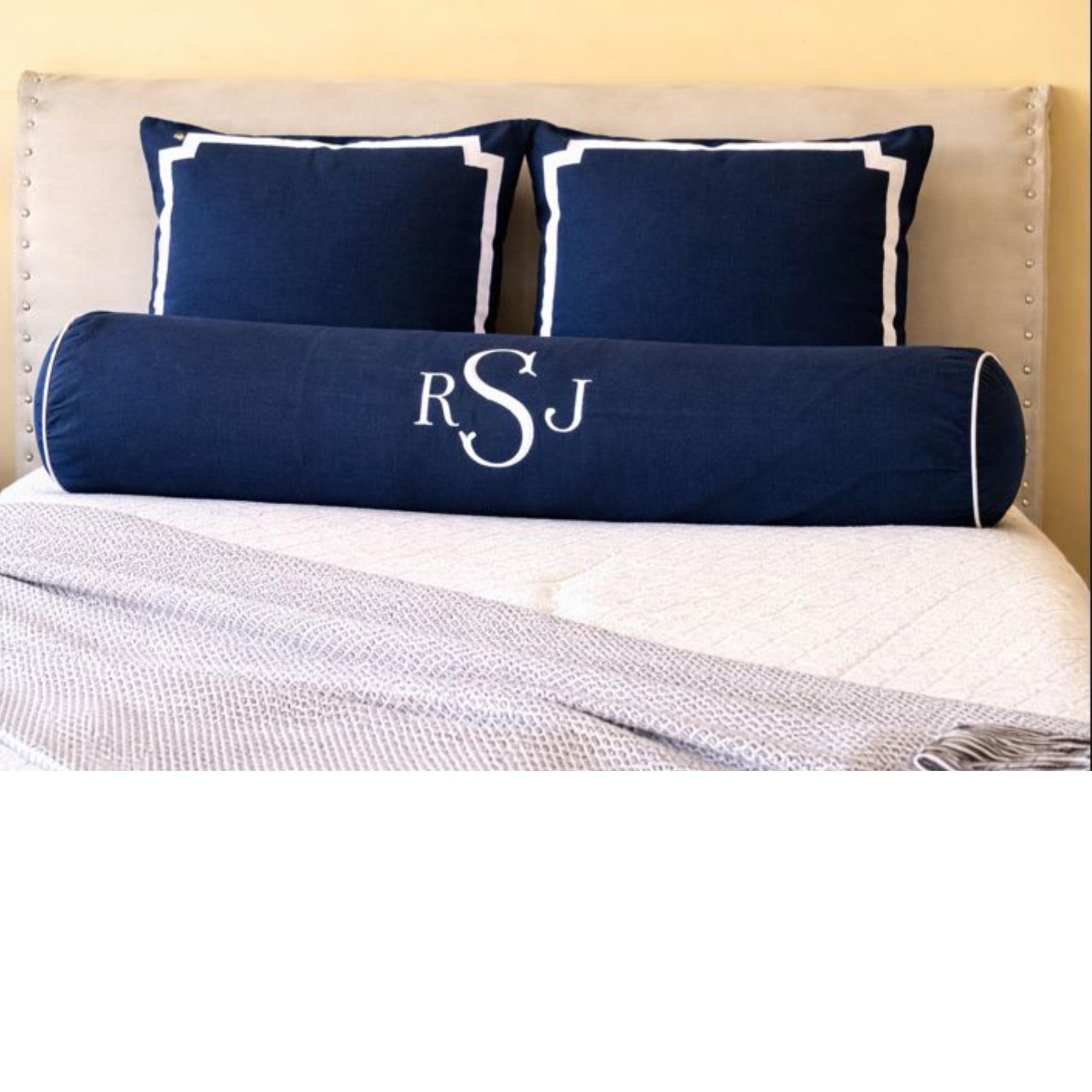 Navy Bedding is Ideal to decorate your bed, Sofa this year. The Pillow set includes one Bolster round pillow one 8"x54"and two (26x26) Euro Shams. The letter lumbar pillow is manually embroidered in the middle. The Cotton decorative pillow is made with 100% hand woven cotton and great pieces to add to your bedroom this year. Invisible zip at the bottom