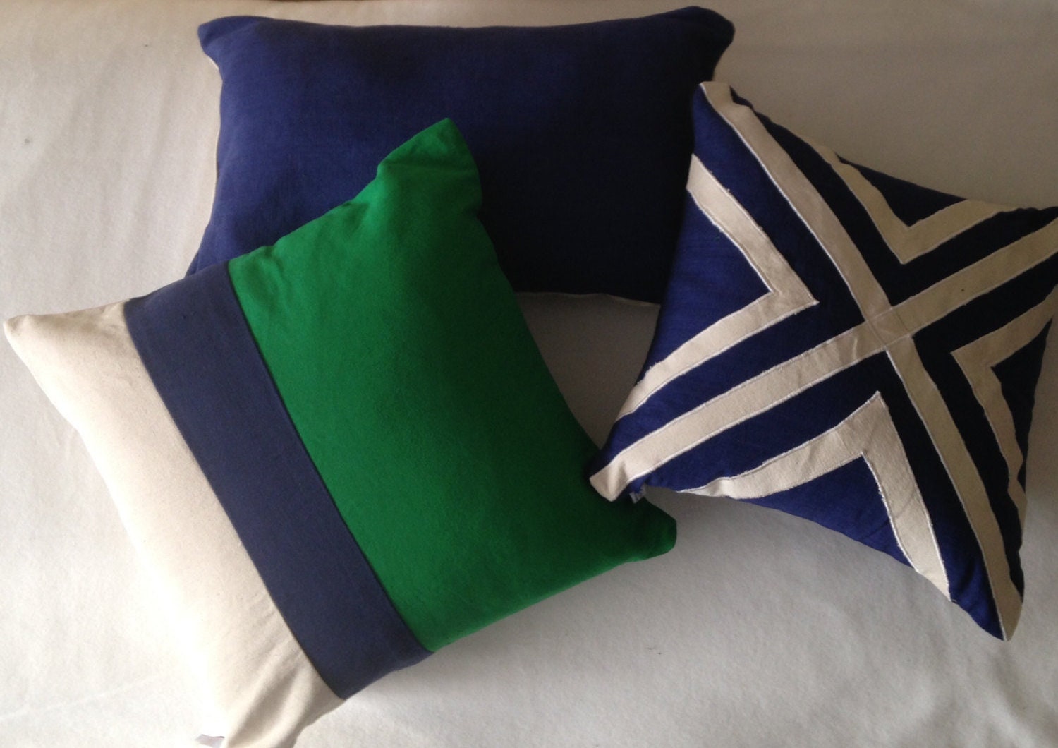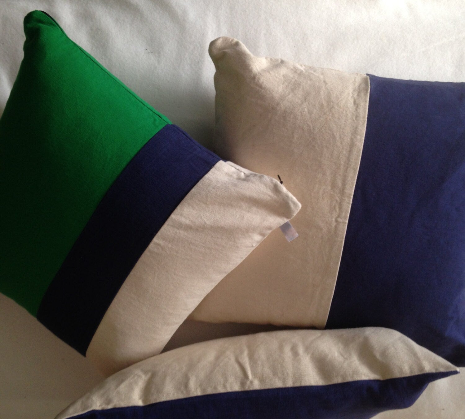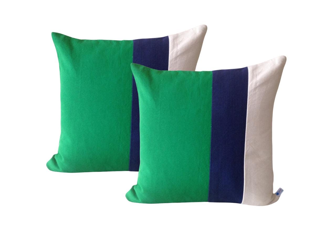 Hand crafted with bottle Green, Navy blue, and Cream pillow cover will make the perfect accent cover on a bed, chair or a sofa. Same stripes at the back. You can display both ways. It would also make a perfect housewarming gift. The decorative pillow cover made with 100% premium cotton handloom. Can't find the color you are looking for? You can custom make the color block pillow covers in any size and colors. For custom order: