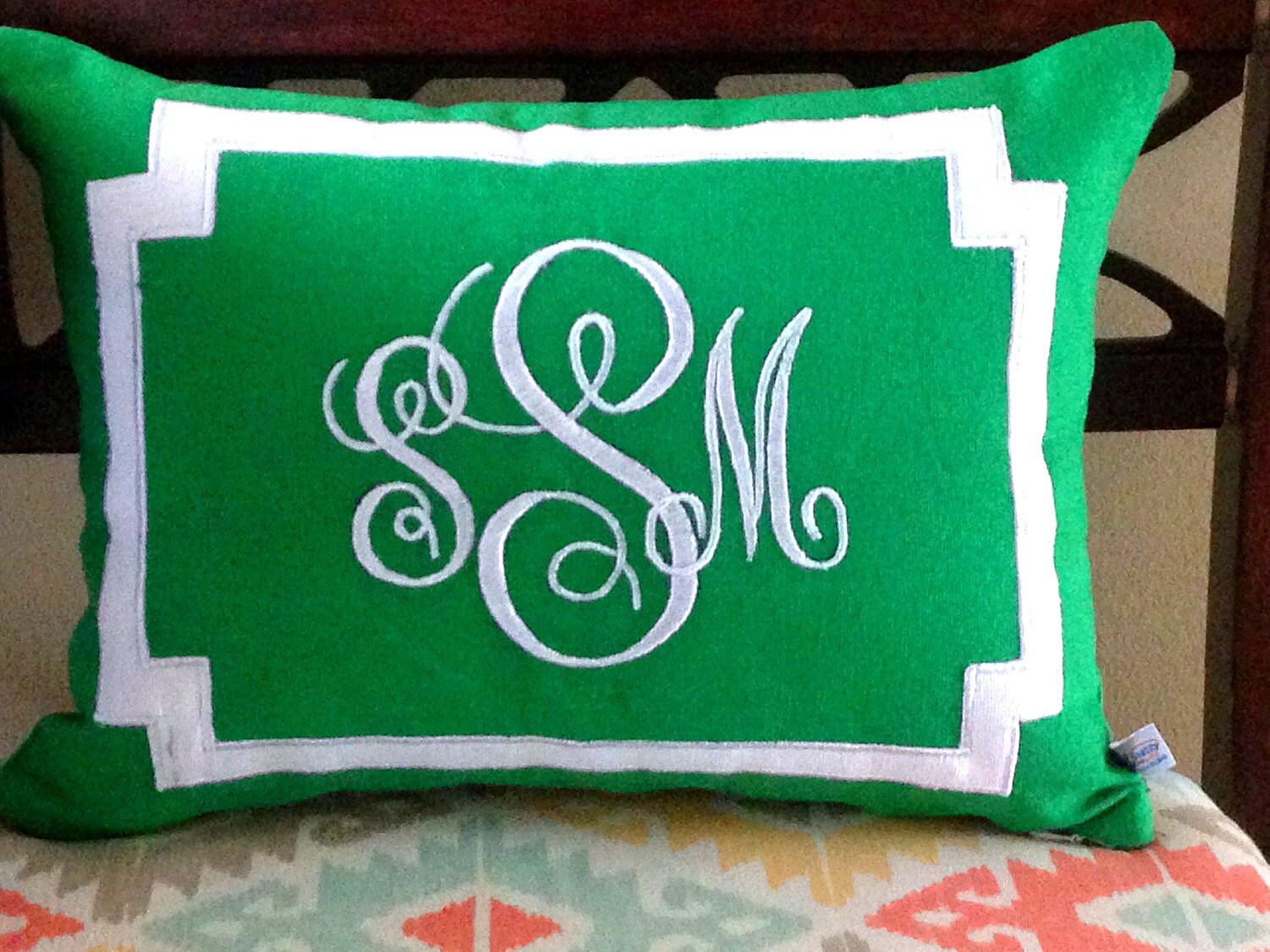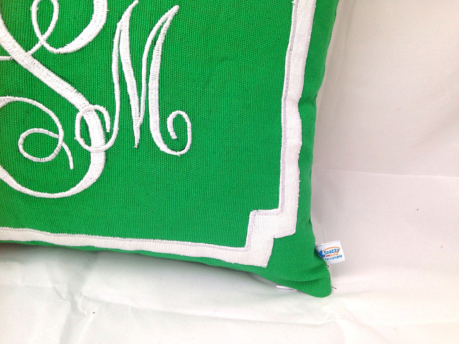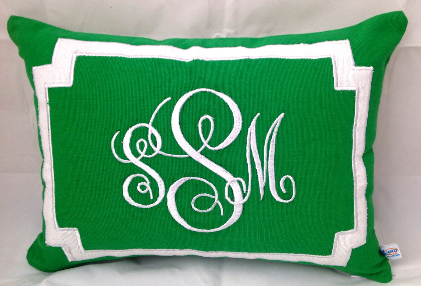Handmade Green 12"x18" Monogram lumbar decorative pillow cover is manually embroidered with three letters in the middle and appliqued white border outside. The green accent pillow cover is a new addition to your sofa, living room or bedroom.