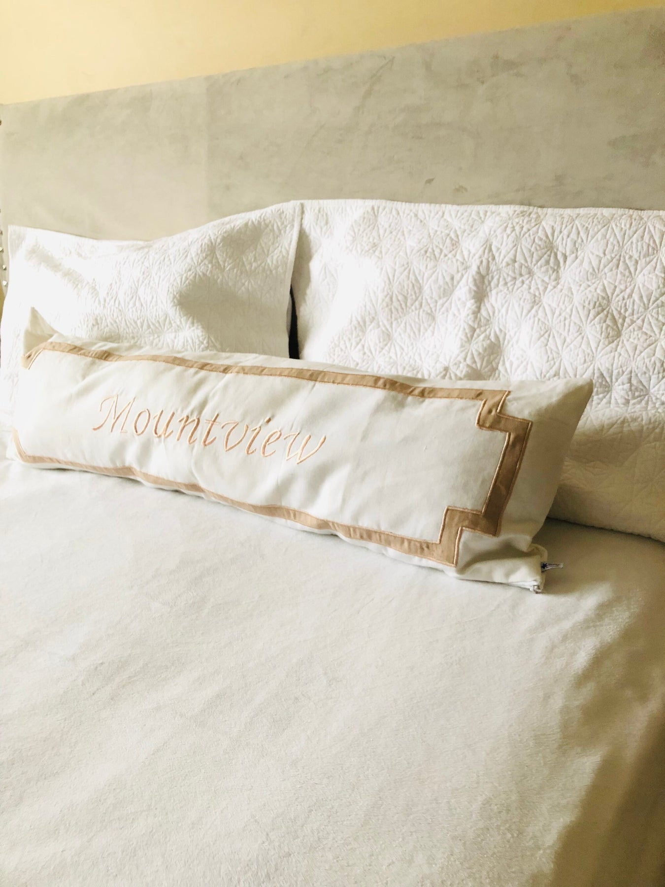 Long baby blue monogrammed pillow cover (12"x40" ) with manually embroidered beige three letter in the middle and appliqued beige border outside. The long monogram pillow cover unique piece to add to your king bed. Made with 100% hand woven cotton these unique pillow covers will be very elegant to decorate your room this year.