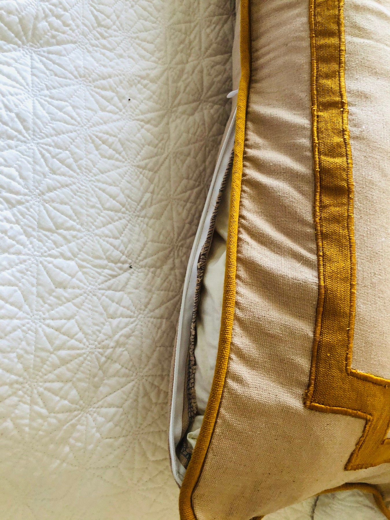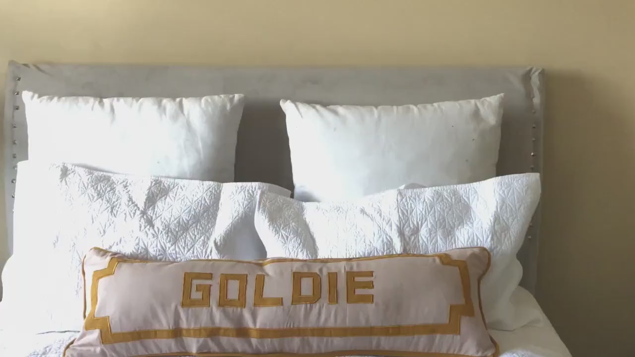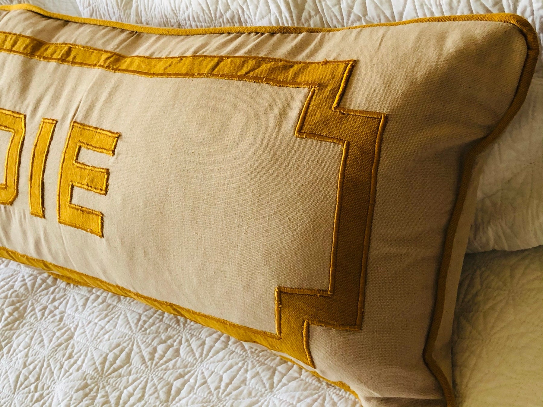 Beige long rectangle body name pillow cover (12"x40" ) with Mustard Yellow manually appliqued letters in the middle and appliqued border outside. The long monogram pillow cover is a unique piece to add to your king bed or queen bed with personalization of your choice. Made with 100% hand woven cotton these unique pillow covers will be very elegant to decorate your room this year.