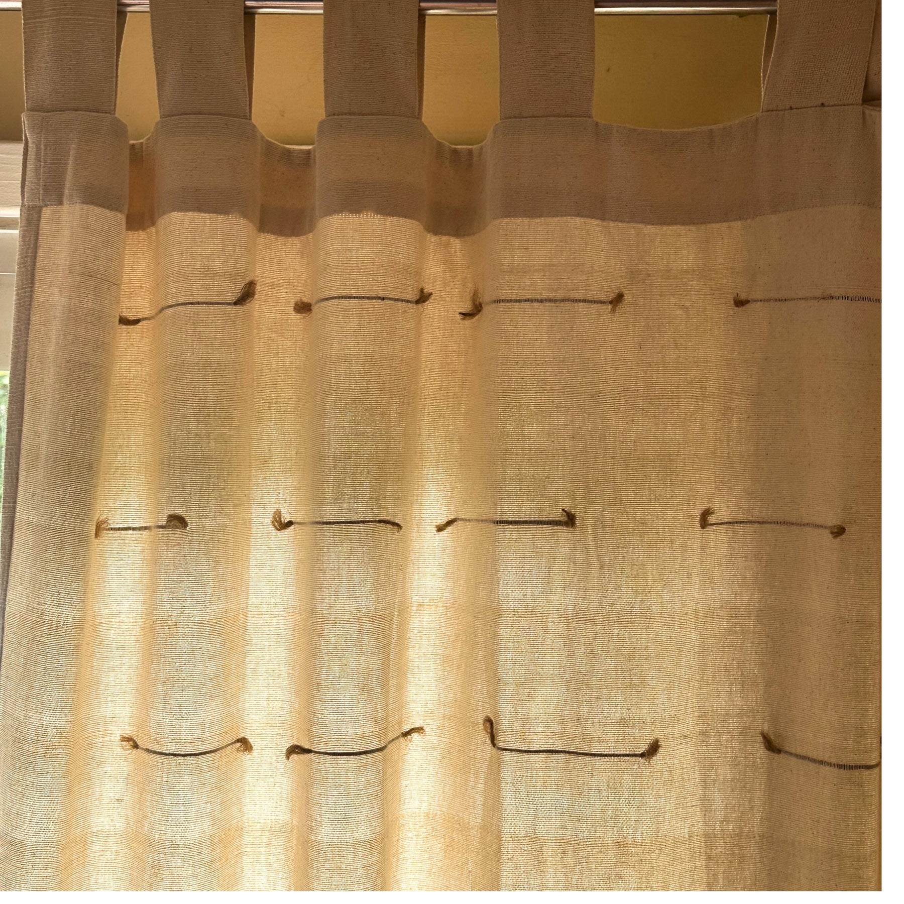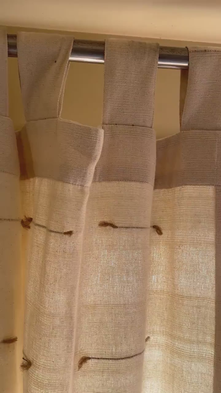 Enhance your living space with our exquisite handmade hand loomed drapes, crafted from natural fibers and finish with Tab Top drape(unlined) to your living room, caostal homeor beach house. Available in various sizes, these eco-friendly curtains add a touch of elegance to any room. Shop now!